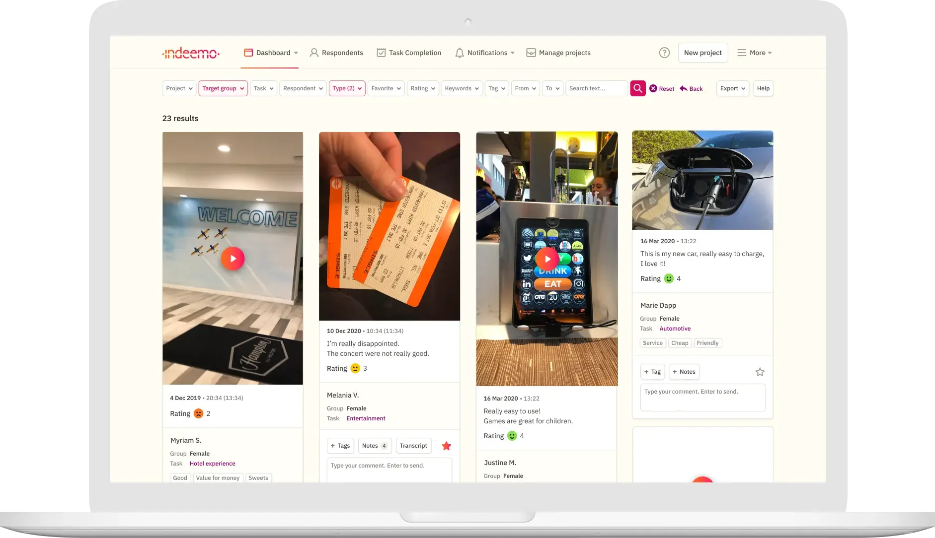 Indeemo is an end-to-end solution for research teams that need to move quickly. Our platform enables you to recruit respondents and launch projects within hours, connect with respondents in any context, and reduce analysis times from days to hours with powerful generative AI analysis tools.