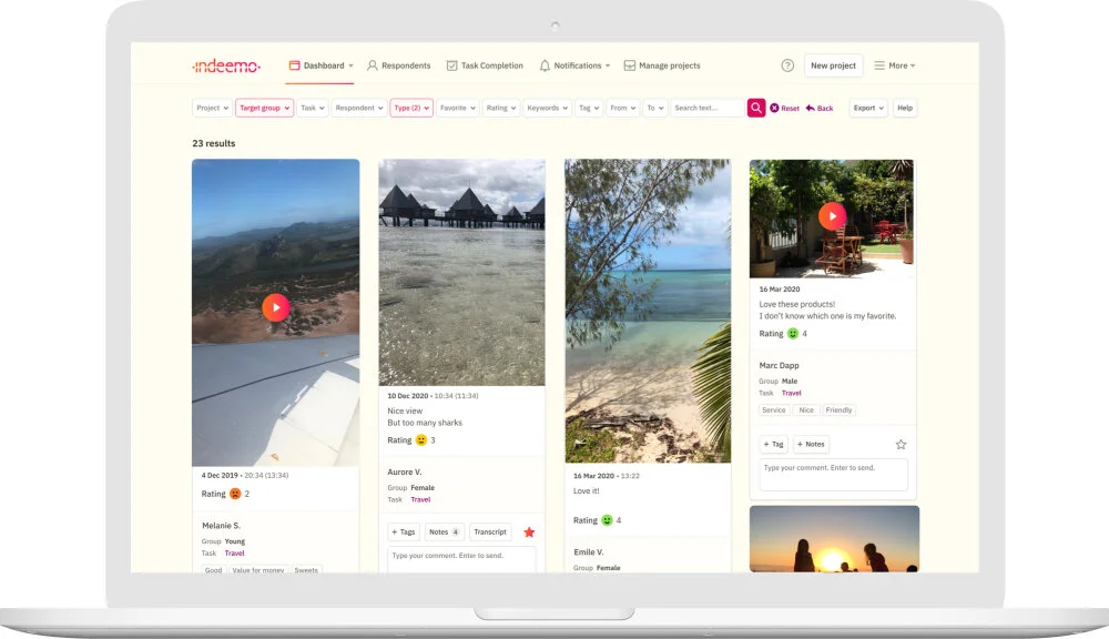 Working with Indeemo, our client decided upon using our scheduled tasking methodology for the project. This allowed them to schedule respondents pre-holiday tasks first and then schedule the holiday tasks prior to their departure. During the course of their holidays, respondents uploaded photos with captions, videos, and text notes, diarying everything from their arrival at the hotel, how they searched for experiences online and reflections on the first, middle and last day of their holiday.